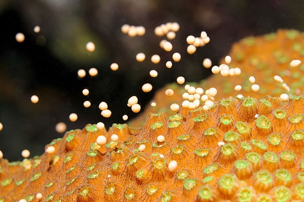- In some cases of external fertilization, coral will release both sperm and eggs into the water column in what is knows as 'coral spawning'.