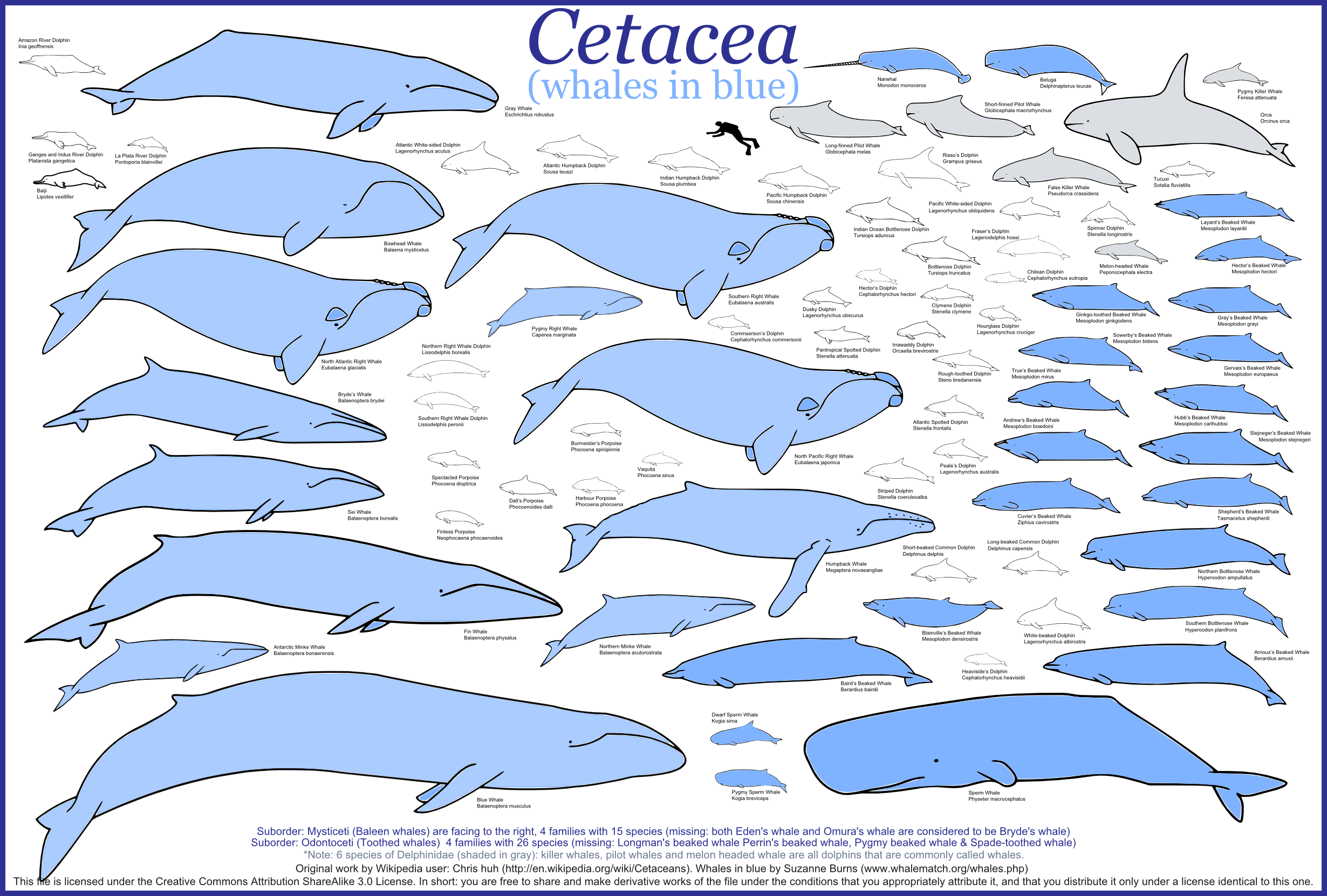 Our oceans are home to 41 species of whale (ITIS), with sizes ranging from the Dwarf sperm whale at 2.5m (8') to the 33m (110') Blue whale, which is the largest animal species to have existed on earth. Being mammals, they are warm-blooded and breathe air, have live births, nurse their young and have hair. The suborder of Mysticeti are baleen whales, females are usually larger than males, and you can see in the size comparison chart that these are the larger Cetaceans. Instead of teeth, they use baleen (long flat keratin plates attached to their upper jaw) to filter food, like plankton and krill. Baleen whales have two blow holes, so you can see a V-shaped blow when they surface. The Odontoceti suborder are toothed whales that hunt and feed on fish, squid and other marine mammals. Killer whales, pilot whales and melon headed whales are actually large dolphins in the Delphinidae family. The other suborder, to which ancient whales belong, is Archaeoceti. These are the terrestrial ancestors of present day whales. Through genetic research, scientists find hippopotumuses to be Cetaceans' closest living relatives.